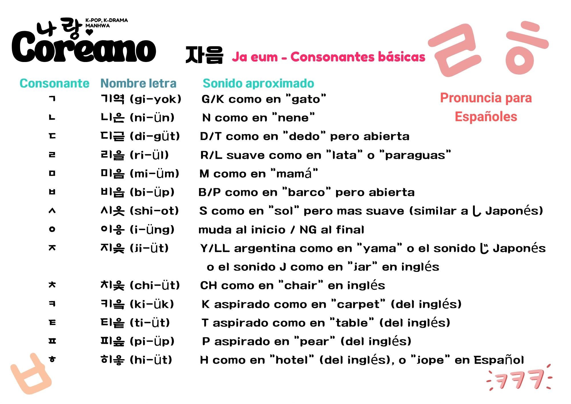 Vamos a ver las letras básicas del coreano: consonantes (자음) y vocales (모음).
